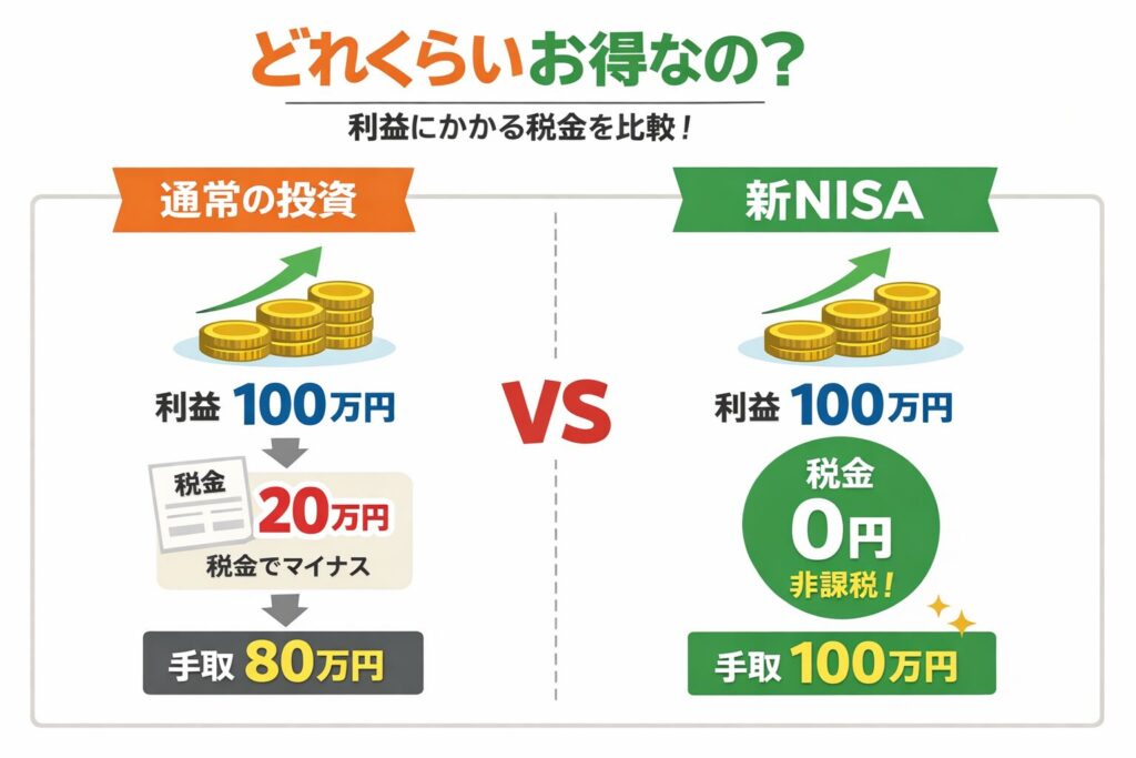 通常の投資では、税金が20%かかるから、100万円に対して20万円の税金が引かれちゃうよ!でも、新NISAなら、100万円まるまる全部もらえちゃう!これが新NISAの良さだよ!